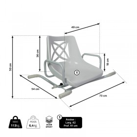 Pas besoin outil, le siège se pose simplement sur les rebords de votre baignoire et se sécurise avec deux stabilisateurs latéraux antidérapants. Son siège englobant est muni de trous facilitant l'écoulement de l'eau.